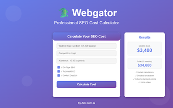 Webgator เป็นส่วนขยาย Chrome ฟรีที่ออกแบบมาเพื่อช่วยธุรกิจและหน่วยงานในการประเมินค่าใช้จ่ายบริการ SEO อย่างมีประสิทธิภาพ เครื่องมือนี้ช่วยให้ผู้ใช้สามารถป้อนปัจจัยที่สำคัญ เช่น ขนาดเว็บไซต์ ระดับการแข่งขัน คำหลักที่ต้องการ และบริการเฉพาะที่ต้องการ มันให้การแยกค่าใช้จ่ายทั้งรายเดือนและรวมของโครงการอย่างละเอียด ทำให้เป็นแหล่งข้อมูลที่มีค่าในการวางแผนงบประมาณ SEO ตัวเลือกบริการที่ปรับแต่งได้รวมถึง on-page, off-page, technical SEO, การสร้างเนื้อหา และ local SEO เพื่อตอบสนองความต้องการที่หลากหลาย.